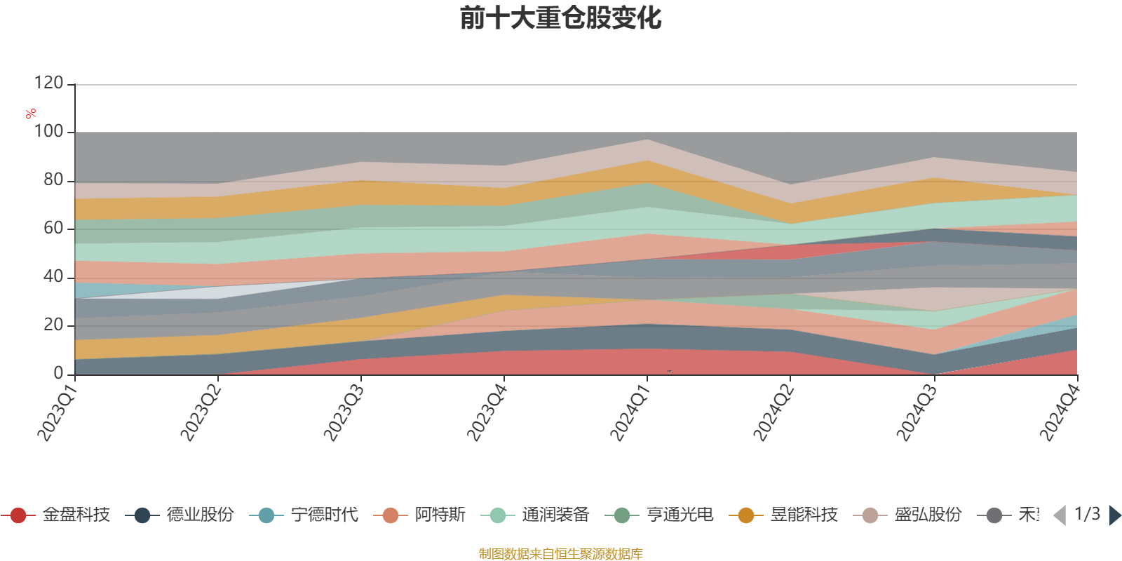 该基金持股集中度较高,近2年前十大重仓股集中度长期超过60%。截至2024年四季度末,基金十大重仓股分别是阳光电源、阿特斯、禾望电气、金盘科技、上能电气、德业股份、禾迈股份、亿纬锂能、宁德时代、锦浪科技。